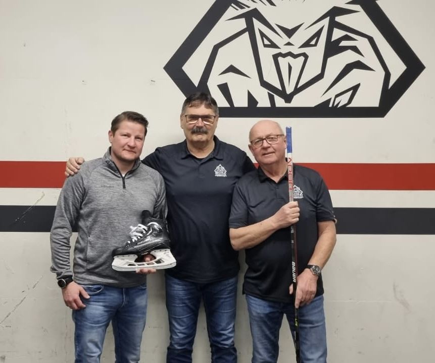 Bild: vlnr: Thomas Kulzer (Account Manager Team Schanner), Alfred Prey (Teammanger Fischtown Pinguins Bremerhaven)  und Eugen Witthohn (Equipment Manager Fischtown Pinguins Bremerhaven)